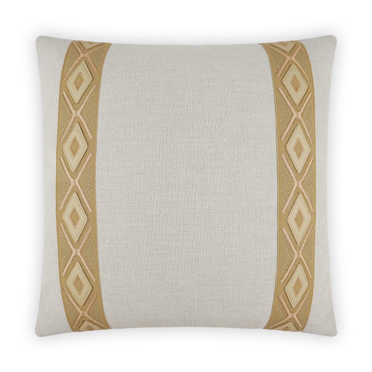 Rochelle – Birch throw pillows by DV Kap Home feature a gold, white/ivory color scheme in a band / ribbon, transitional design. Each throw pillow includes a removable cover with hidden zipper and a 95% feather, 5% down insert. Handcrafted in California using fabrics sourced right here in the USA.