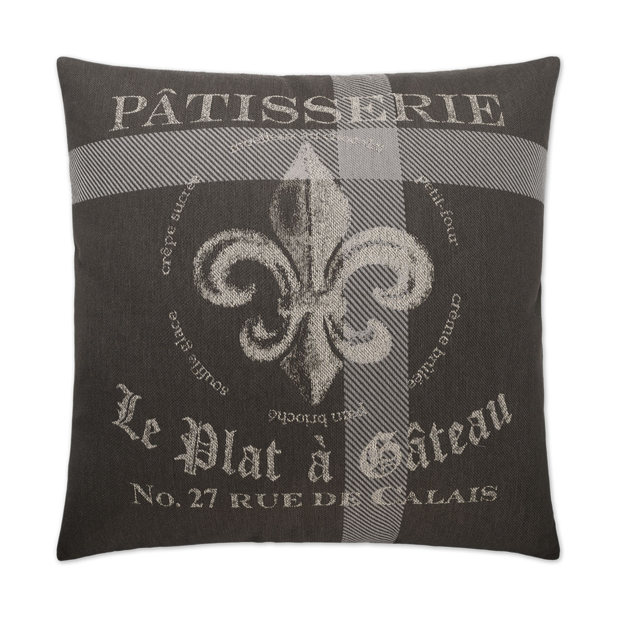 Patisserie throw pillows by DV Kap Home feature a grey color scheme in a traditional, novelty design. Each throw pillow includes a removable cover with hidden zipper and a 95% feather, 5% down insert. Handcrafted in California using fabrics sourced right here in the USA.