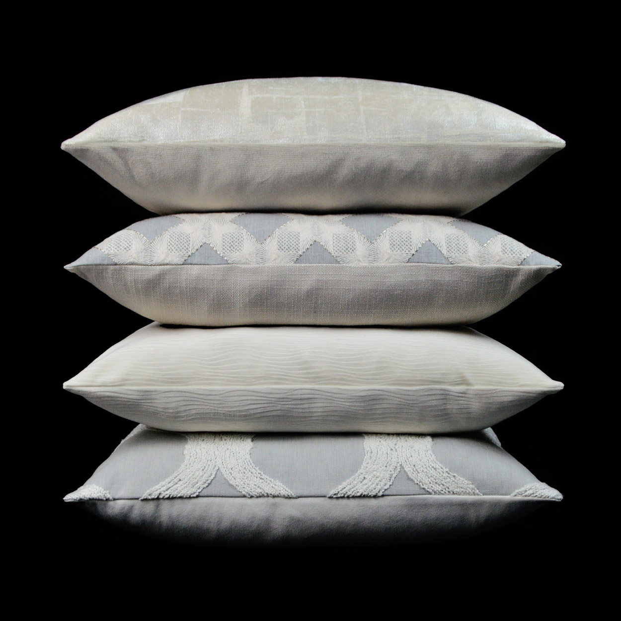 Glam – Silver throw pillows by DV Kap Home feature a silver, white/ivory color scheme in a glam, abstract design. Each throw pillow includes a removable cover with hidden zipper and a 95% feather, 5% down insert. Handcrafted in California using fabrics sourced right here in the USA.