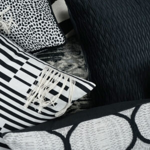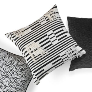 Loose Ends throw pillows by DV Kap Home feature a white/ivory, black color scheme in a textured, modern design. Each throw pillow includes a removable cover with hidden zipper and a 95% feather, 5% down insert. Handcrafted in California using fabrics sourced right here in the USA.