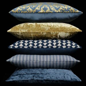 Pantheon – Midnight throw pillows by DV Kap Home feature a gold, blue color scheme in a traditional design. Each throw pillow includes a removable cover with hidden zipper and a 95% feather, 5% down insert. Handcrafted in California using fabrics sourced right here in the USA.