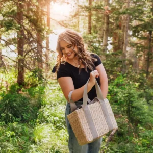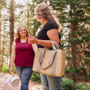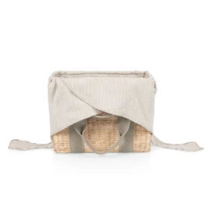 Our Parisian Picnic Basket combines style with function! Made from woven seagrass with insulation inside, this basket easily fits a full baguette thanks to its special fabric tie closure. Pack up to 20 cold drinks, cheeses, meats, or market finds. Perfect for concerts, picnics, or shopping trips with its classic French-inspired look that turns heads everywhere you go. Sage green straps and striped liner.