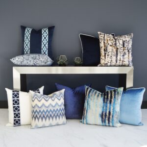 Proden – Blue throw pillows by DV Kap Home feature a blue color scheme in a transitional, stripes design. Each throw pillow includes a removable cover with hidden zipper and a 95% feather, 5% down insert. Handcrafted in California using fabrics sourced right here in the USA.