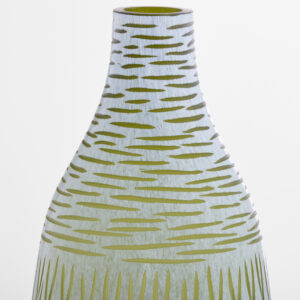These remarkable vases showcase the incredible skill of glass artists. Each piece begins with a bright chartreuse green base that’s then covered with a layer of off-white glass.